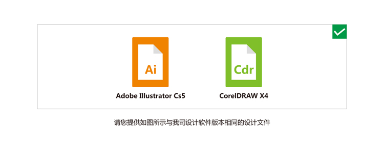完稿后请储存相对稳定的版本,云印广告Illustrator目前版本最高到CS5,Coreldraw目前版本最高到X4。请您不要上传过高的版本,这样会导致文件高低版本转换之间发生一些不可控的变化。